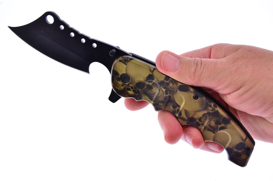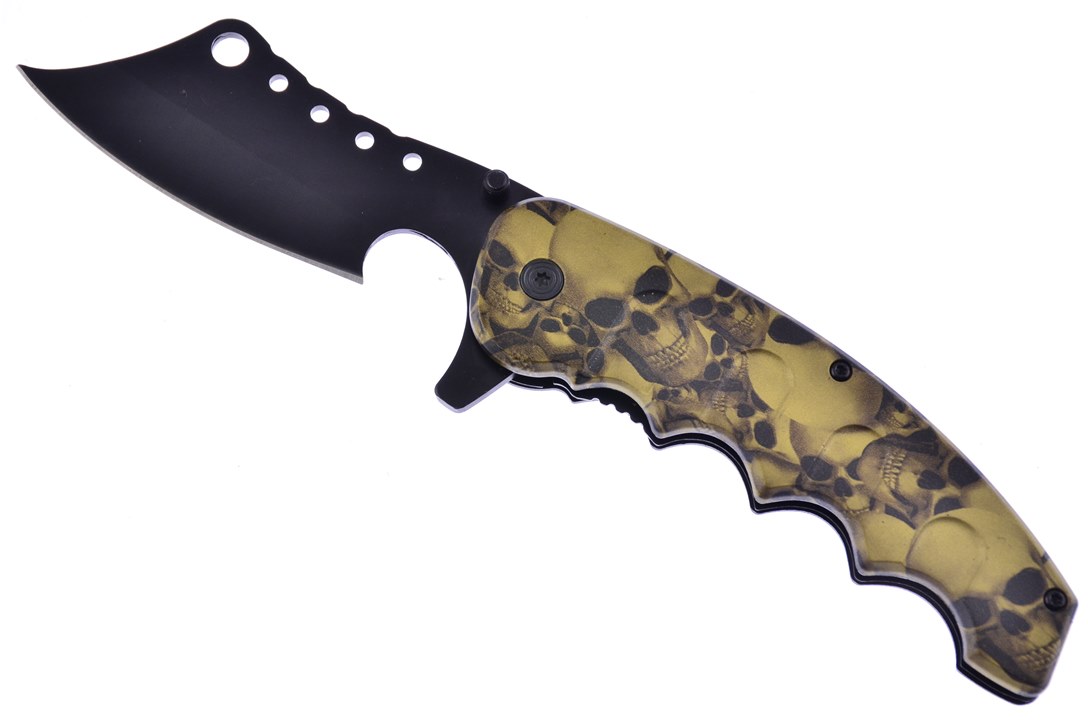 It may not be Halloween yet but this is any horror movie lovers dream! This tactical folder features a golden skull design on its handle with a black matte stainless steel blade. Designed for precision and longevity, the stainless steel blade is built to resist corrosion and maintain a sharp edge with minimal maintenance. This makes it the perfect addition to anyones collection who wants to be able to show off a little bit of their personality while also having a functional tool.
