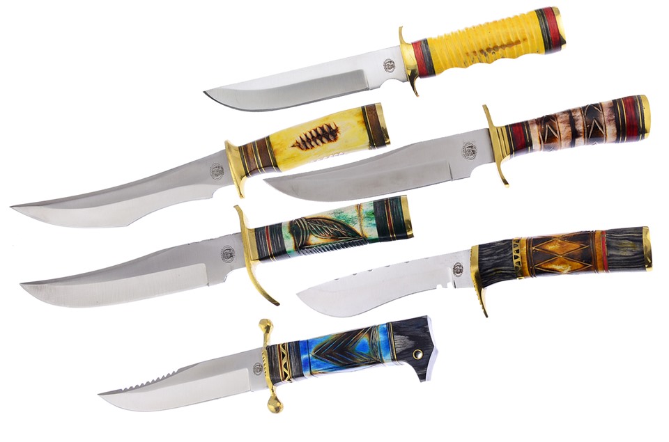The Chipaway Cutlery Bowie collection by Frost Cutlery features a diverse range of fixed-blade knives with classic frontier aesthetic and affordable prices. This 6-piece set features bone handles and unique burned handle designs.