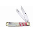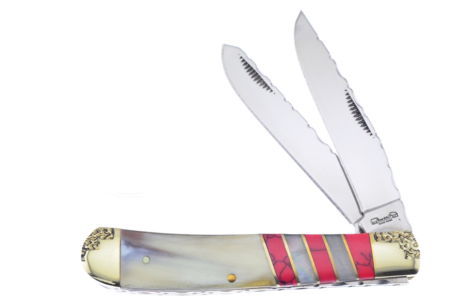 This 4 1/4" Ox Horn/Red/MOP Combination Trapper is another great piece from Bear N Bull. With Decorative Handle, Tooled Spine, and Nickel Silver Spacers, this is going to be flying off the shelves, so don't miss your chance to get one!