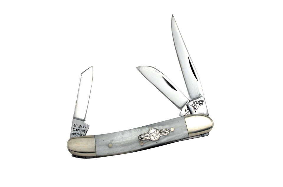 This German Bull 3 1/4" Cracked Ice Celluloid Range Rider is a customer favorite! With Brass Pins and Thumbnail Pull, this is going to be flying off the shelves, so don't miss your chance to get one!