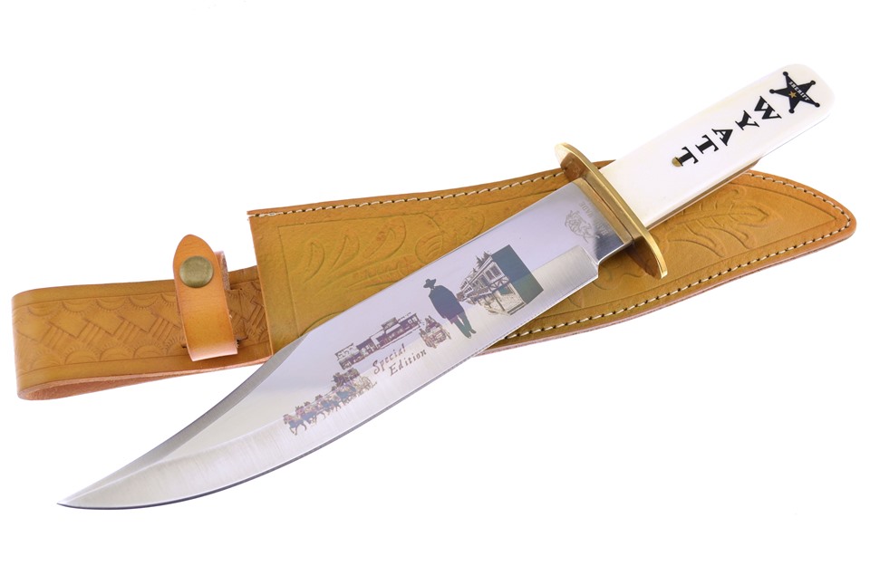 We think you're going to like this 14" White Smooth Bone Bowie! It has Stainless Steel Blade and Full Tang Construction and this is going to be flying off the shelves, so don't miss your chance to get one!