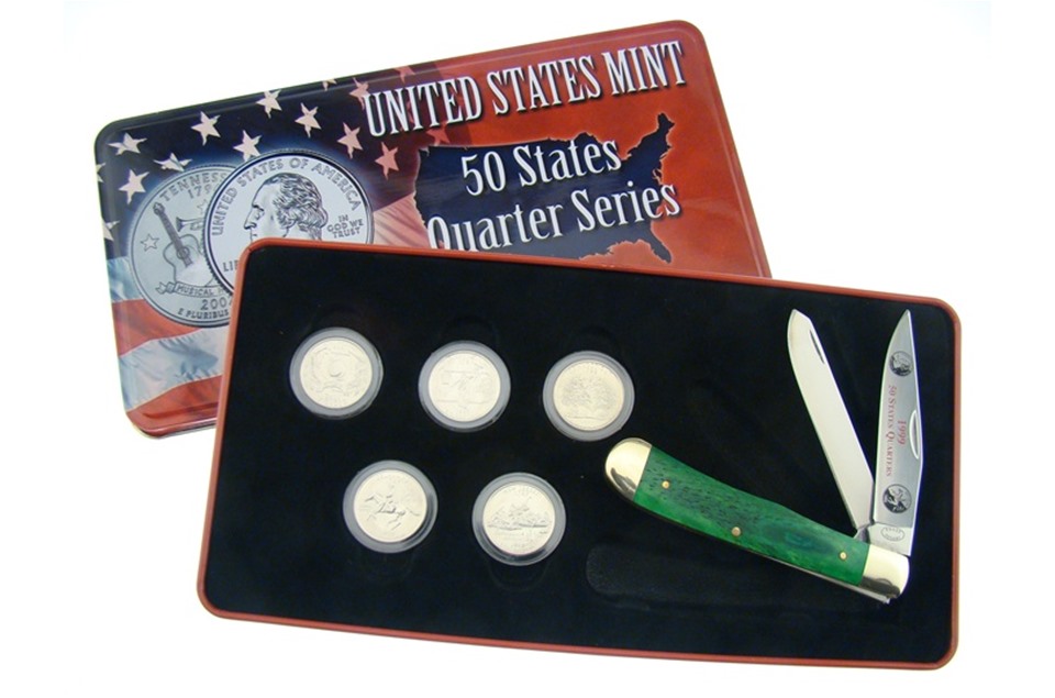 Frost Cutlery brings you this 4 1/4" Green Smoothbone Bone State Quarter Collection. It has Nickel Silver Bolsters and Etched Blade and the full set of 1999 State Quarters in Flips, so you need to pop this in your cart now while supplies last!