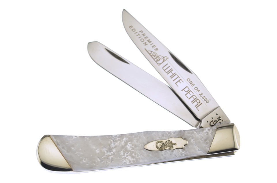 We think you're going to like this 4 1/8" White Pearl CorelonĀ® Trapper! With Etched Blade, Custom Shield, and Slanted Nickel Silver Bolsters, this is going to be flying off the shelves, so don't miss your chance to get one!