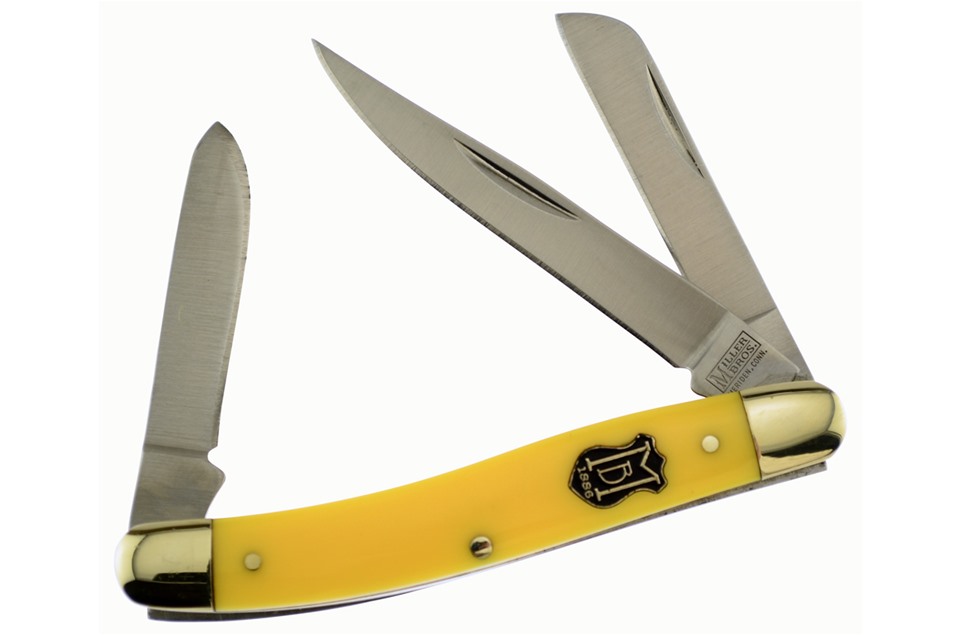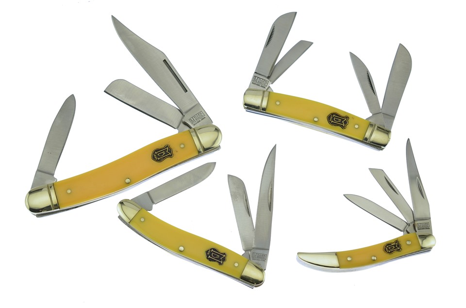 This set is a great addition to any collection. You'll receive one of the 4 5/8" Yellow Composite Large Stockmans, one of the 3" Yellow Composite Toothpicks with Brass Pins, one of the 3 1/2" Yellow Composite Congresss, one of the 3 1/2" Yellow Composite Stockmans, featuring Nickel Silver Bolsters. You won't find a lower price anywhere!