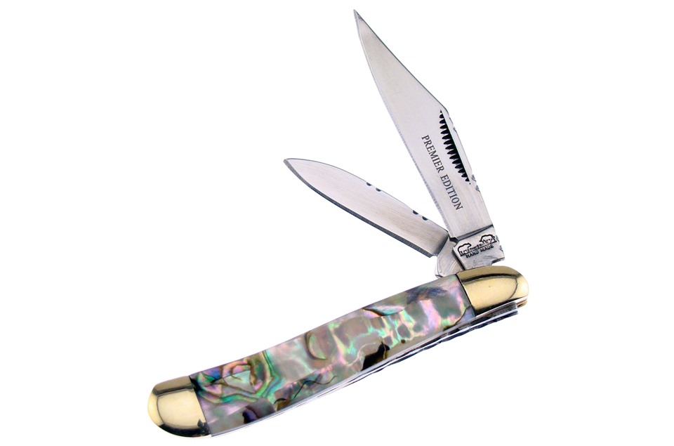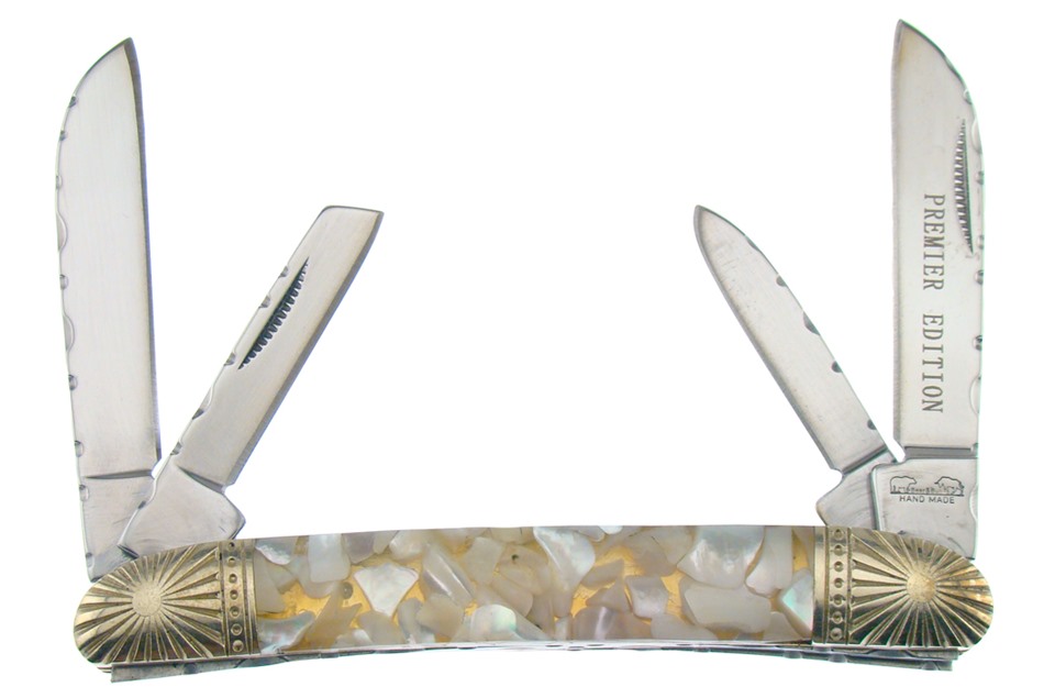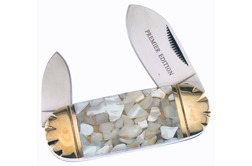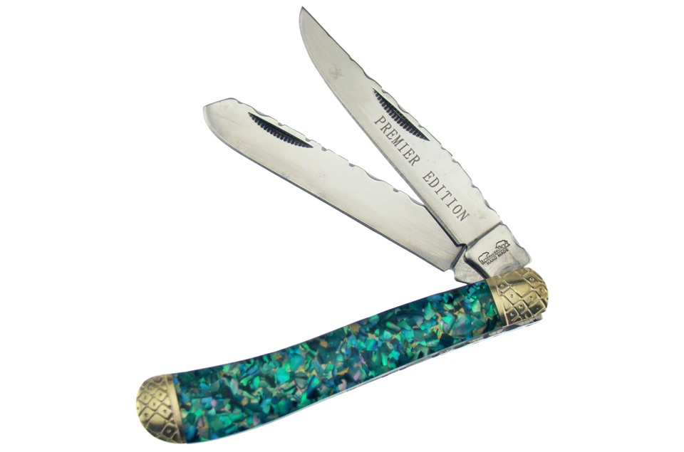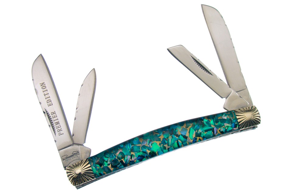 This set by Bear N Bull is a great addition to your collection! Included in this set is one of the 2 7/8" Abalone Peanuts, one of the 4" Crushed Mother of Pearl Razors, one of the 3 7/8" Green Cracked Abalone Trappers, one of the 2 7/8" Crushed Mother of Pearl Sunfishs, one of the 3 7/8" Crushed Mother of Pearl Swayback s, featuring Nickel Silver Bolsters, one of the 3 5/8" Green Cracked Abalone Congresss, featuring Engraved Bolsters. Sets like these go fast, so get yours while you can!