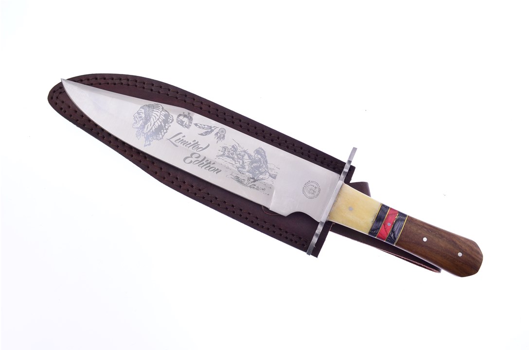 The 14 1/2" Wood/Bone Combination Bowie by Chipaway Cutlery is a long-time best-seller! With Brass Spacers, Stainless Steel Blade, and Leather Sheath, stock is limited, so add to your cart before they are all gone.
