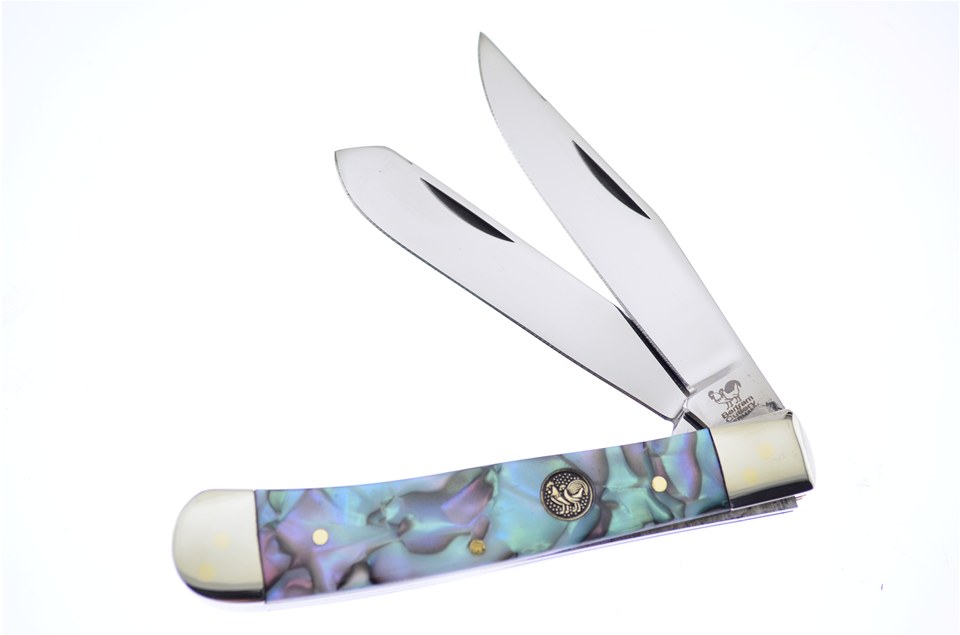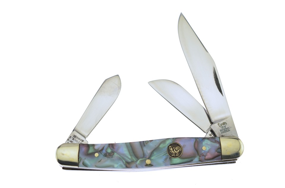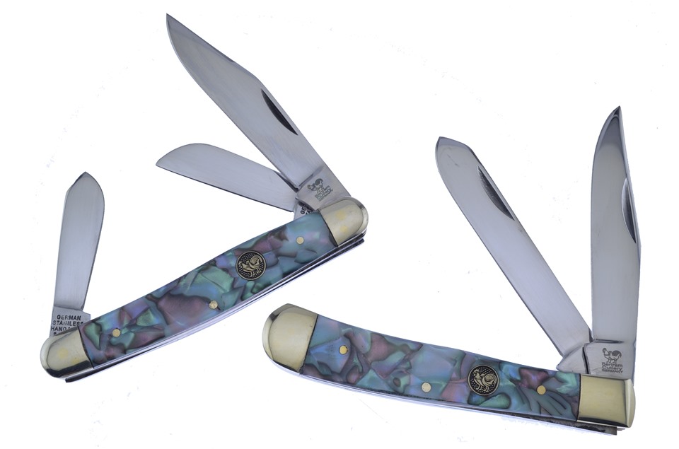 This set is a great addition to any collection. You'll get one of the 4 1/8" Mosiac Celluloid Trappers, one of the 4" Mosiac Celluloid Stockmans. You won't find a lower price anywhere!