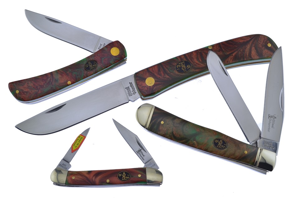 Here's a set of knives no collector will want to miss. You'll receive one of the 4 1/4" Christmas Tree Composite Trappers, one of the 4 3/4" Christmas Tree Composite Utility Knifes, featuring Stainless Steel Blade, one of the 4 1/2" Christmas Tree Composite Utility Knifes with Stainless Steel Blade, one of the 3" Christmas Tree Composite Little Copperheads. Not all of these components will stay in stock, so throw this in your shopping cart now!