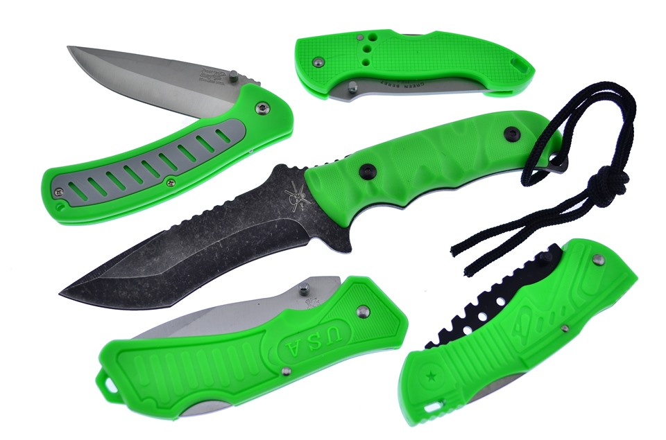 Just the thing for knife collectors everywhere. You'll get one of the 4 1/2" Green Composite Tactical Folders, one of the 5 1/4" Green Composite Buckshots with Lockback, one of the 4 1/2" Green Composite Folders, one of the 9" Green Rubber Bowies, featuring Nylon Sheath, one of the 5" ABS Composite Tactical Folders with Belt Clip. Not all of these components will stay in stock, so throw this in your shopping cart now!