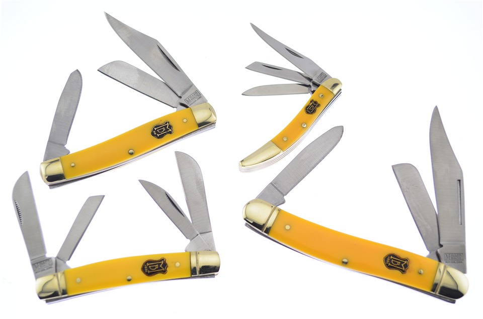 Here is a set of Miller Bros. knives you don't want to miss! You'll receive one of the 4 5/8" Yellow Composite Large Stockmans, one of the 3" Yellow Composite 3-Blade Toothpicks, featuring Stainless Steel Blade, one of the 3 1/2" Yellow Composite Congresss, featuring Brass Liners, one of the 3 7/8" Yellow Composite Stockmans. Sets like these go fast, so get yours while you can!