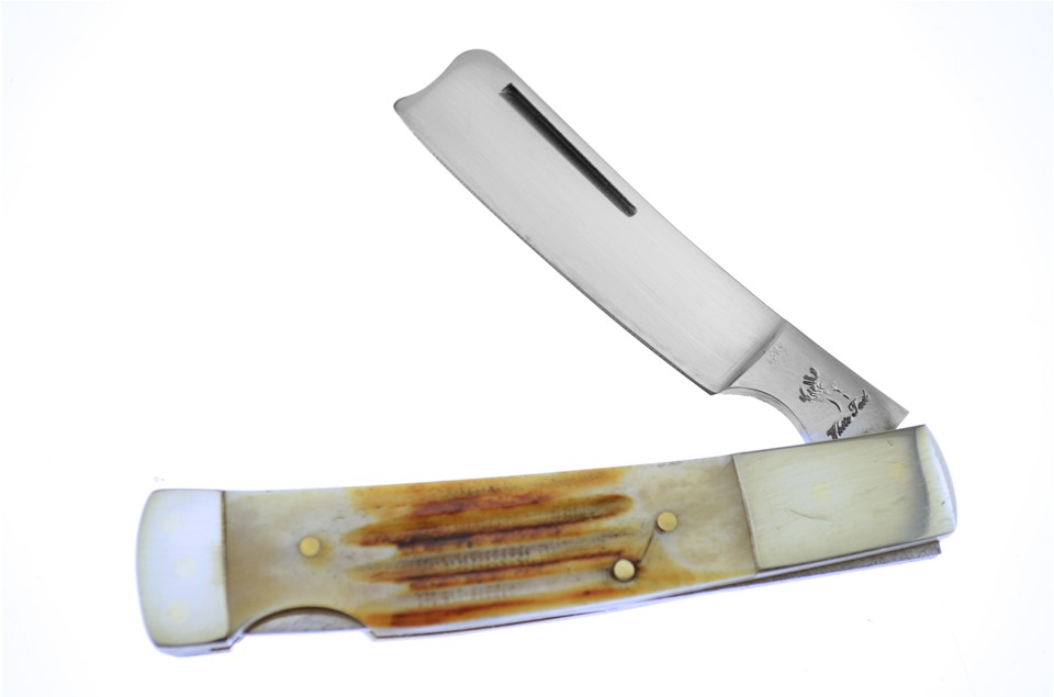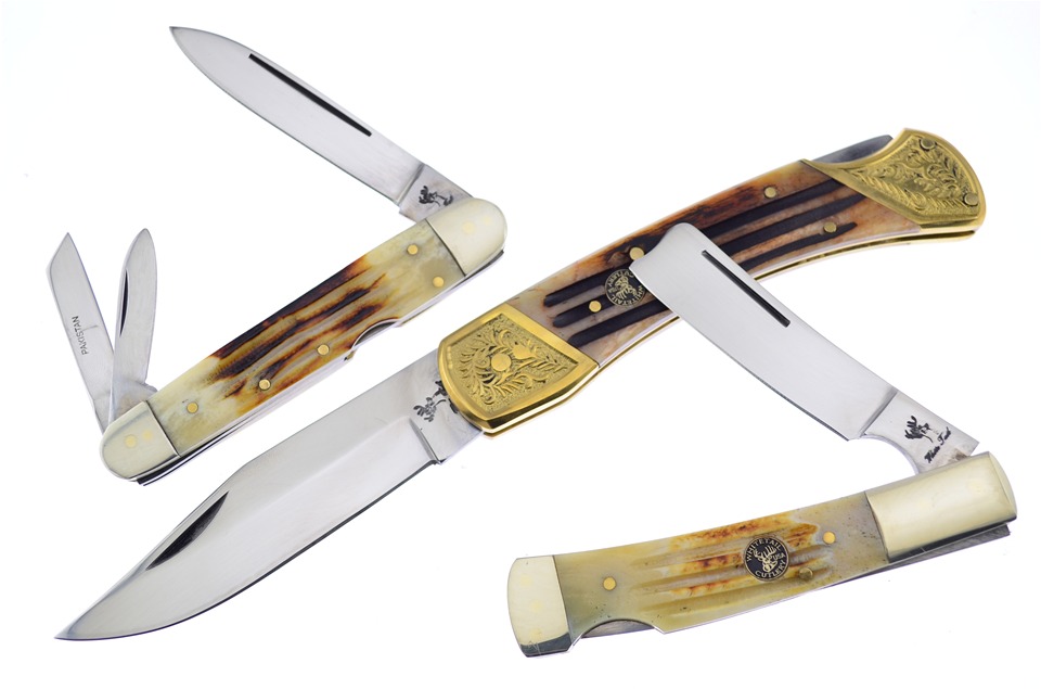 Just the thing for knife collectors everywhere. Included in this set is one of the Nylon Sheaths, one of the 5" Second Cut Bone Bear Claws with Stainless Steel Blade, one of the 4" Second Cut Bone Razor Locks with Brass Pins, and one of the 3 3/4" Second Cut Bone Whittlers with Nickel Silver Bolsters. You won't find a lower price anywhere!