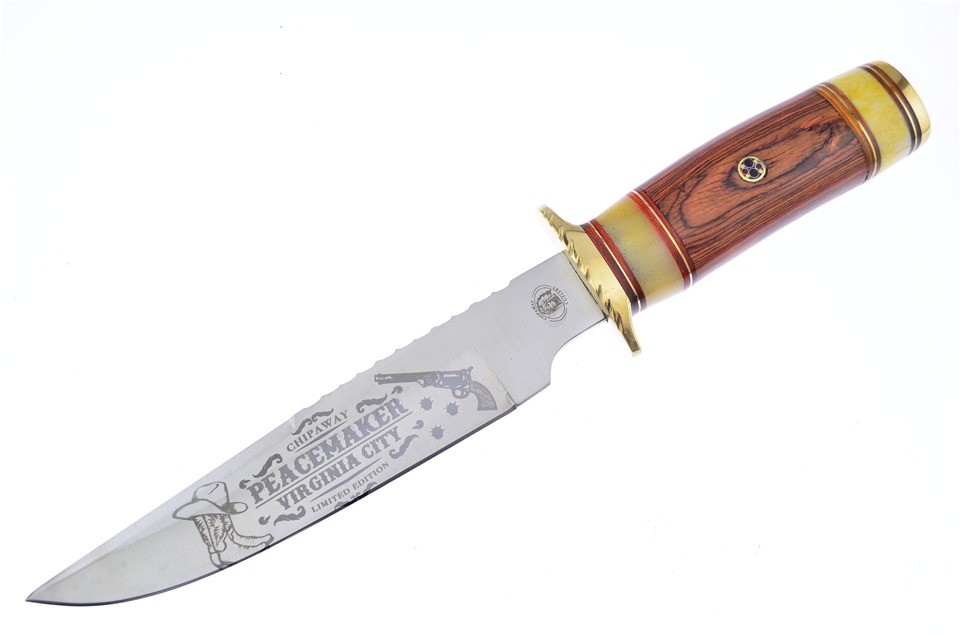This Chipaway Cutlery 12" Wood Bowie is a customer favorite! With an Etched Stainless Steel Blade, Brass Spacers, and Wood Spacers, you need to pop this in your cart now while supplies last!