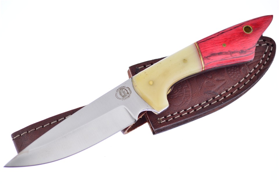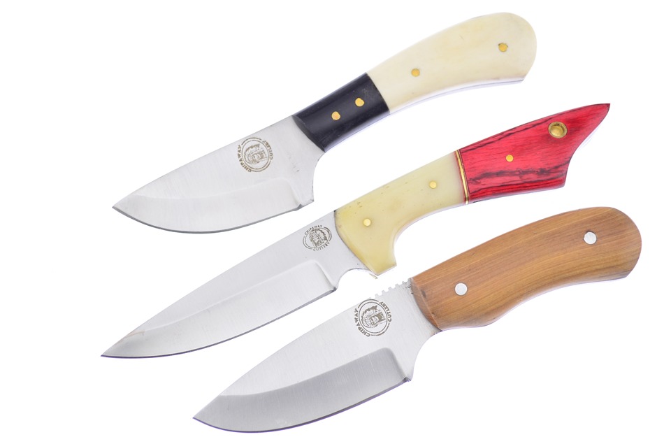 Here's a set of knives no collector will want to miss. Included in this set is one of the 6 1/2" Olivewood Bowies, one of the 8 1/2" Bone/Horn Combination Bowies, featuring Brass Pins, and one of the 8" Wood/Bone Combination Skinners. Not all of these components will stay in stock, so throw this in your shopping cart now!