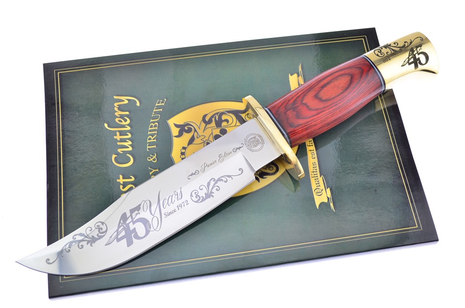 This set is a great addition to any collection. Included in this set is one of the 11 1/2" 45th Anniversary edition Cocobolo Wood Bowies and one of the Frost Cutlery History Books. Sets like these go fast, so get yours while you can!