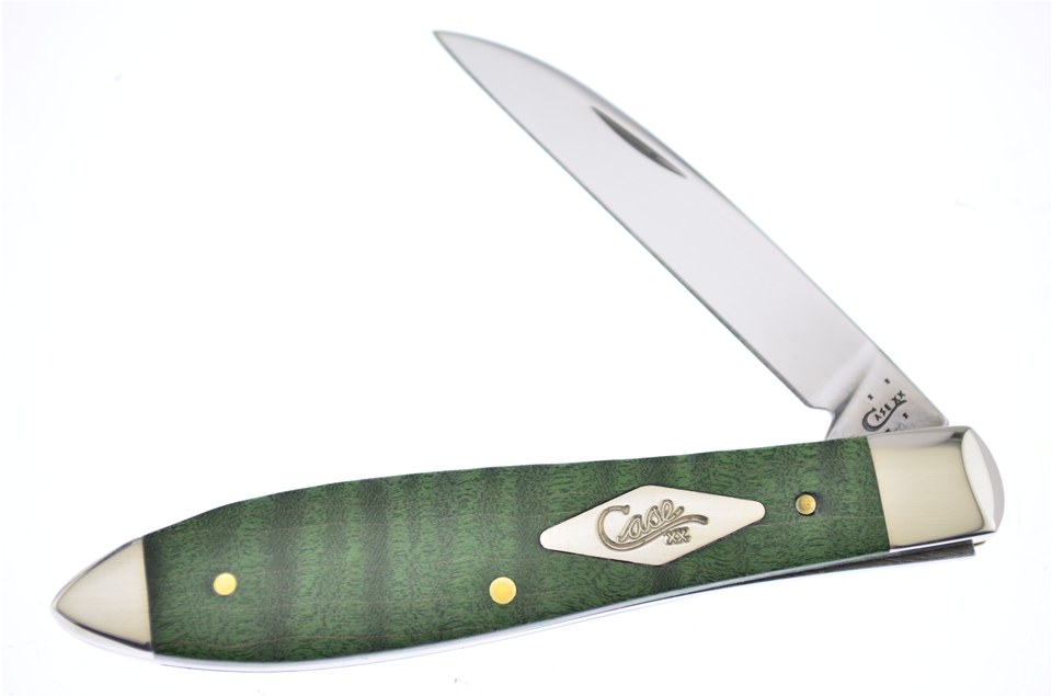 Case brings you this 3 1/2" Green Curly Maple Wood Teardrop. It has Nickel Silver Bolsters and Brass Pins and a Stainless Steel Blade. No one can resist, so get yours while you can!