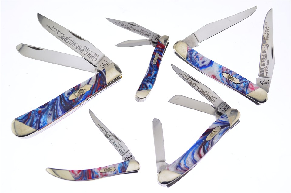This set is a great addition to any collection. Included in this set is one of the 3" Star Spangled Banner Corelon® Toothpicks, one of the 3 7/8" Star Spangled Banner Corelon® Muskrats, featuring Surgical Steel Blade, one of the 2 7/8" Star Spangled Banner Corelon® Peanuts, one of the 4 1/8" Star Spangled Banner Corelon® Trappers, and one of the 3 5/8" Star Spangled Banner Corelon® Medium Stockmans with Slanted Bolsters. Sets like these go fast, so get yours while you can!