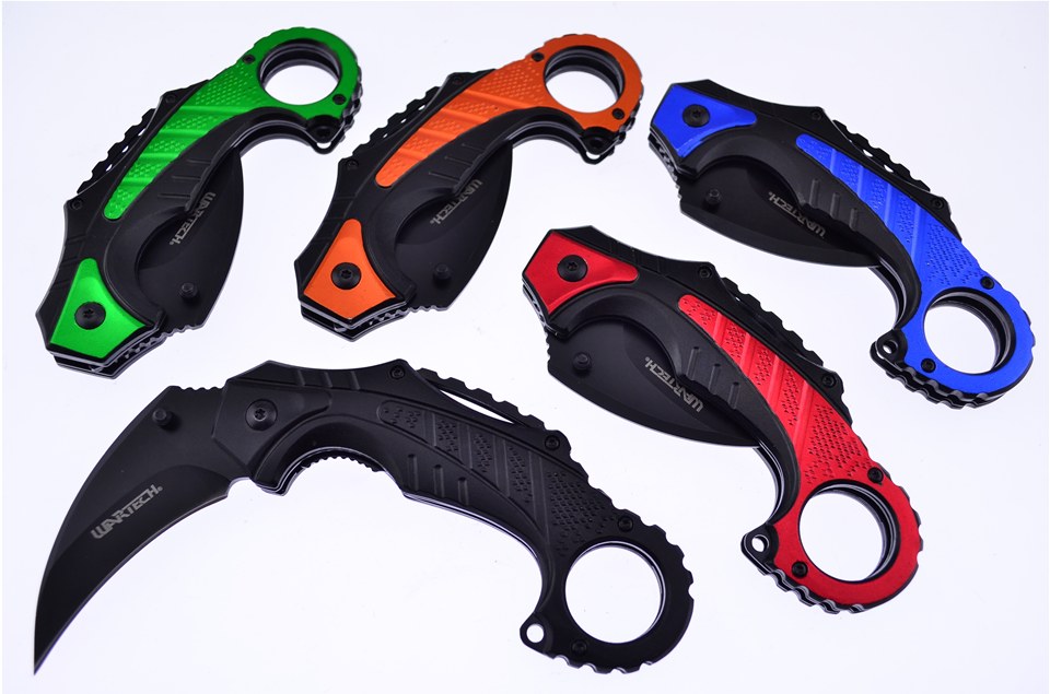 Here is a set of WarTech knives you don't want to miss! Included in this set is one of the 5 1/8" Black Anodized Aluminum Karambits, one of the 5 1/8" Black/Blue Anodized Aluminum Karambits with Metal Pins, one of the 5 1/8" Black/Green Anodized Aluminum Karambits with Metal Pins, one of the 5 1/8" Black/Orange Anodized Aluminum Karambits with Liner Lock, and one of the 5 1/8" Black/Red Anodized Aluminum Karambits with Black Matte Stainless Steel. Not all of these components will stay in stock, so throw this in your shopping cart now!