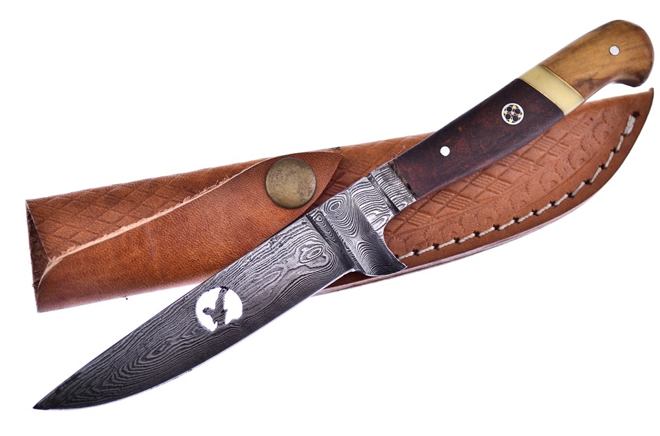 Valley Forge brings you this 8 1/4" Wood/Bone Combination Bowie. With Damascus Blade, Damascus Bolsters, and Stainless Steel Pins, this item is going to sell like hotcakes, so get yours now.