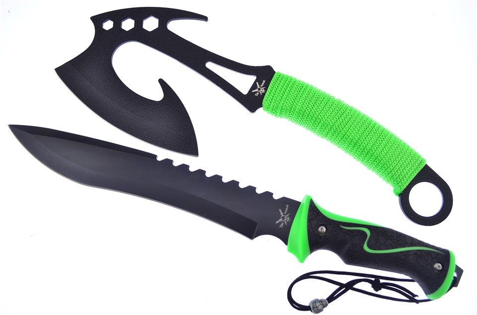 Here's a set of knives no collector will want to miss. Included in this set is one of the 14" Cord Wrapped Metal Axes and one of the 15" Black/Green Composite Bowies with Half-Serrated Blade. Sets like these go fast, so get yours while you can!