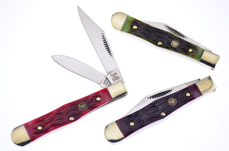 Just the thing for knife collectors everywhere. You'll get one of the 3" Antique Green Bone Coke Bottle Folders, one of the 3" Brown Bone Coke Bottle Folders with Brass Pins, and one of the Red Picked Bone Coke Bottle Folders, featuring German Steel. You won't find a lower price anywhere!