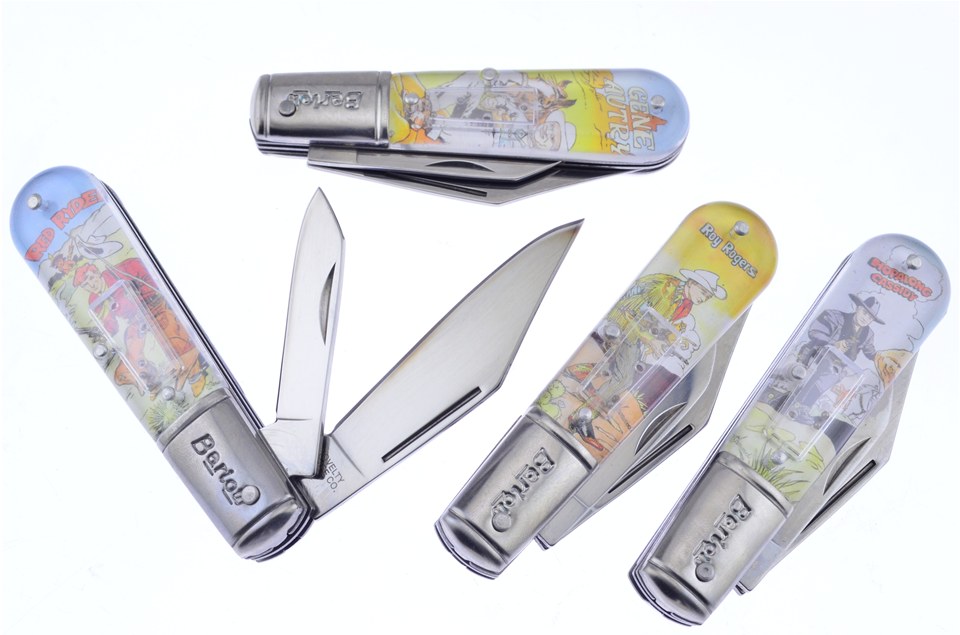 Just the thing for knife collectors everywhere. Included in this set is one of the Gene Autry Composite Barlows, one of the Hopalong Cassidy Composite Barlows, featuring Stainless Steel Blade, one of the Red Ryder Composite Barlows with Nickel Silver Bolsters, and one of the Roy Rogers Composite Barlows, featuring Etched Bolsters. You won't find a lower price anywhere!