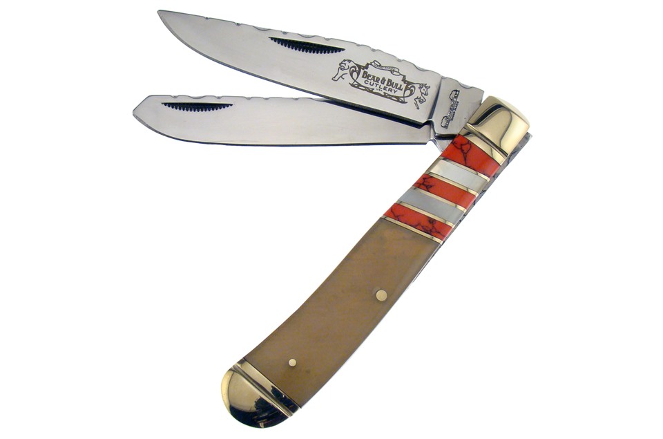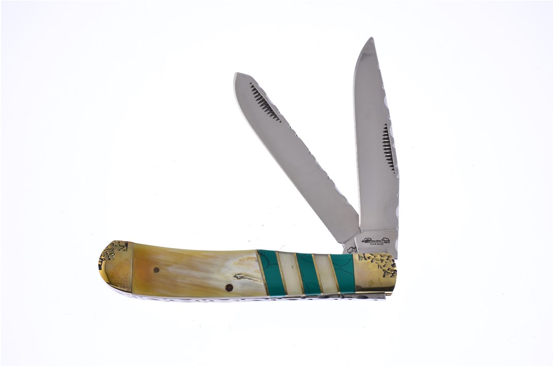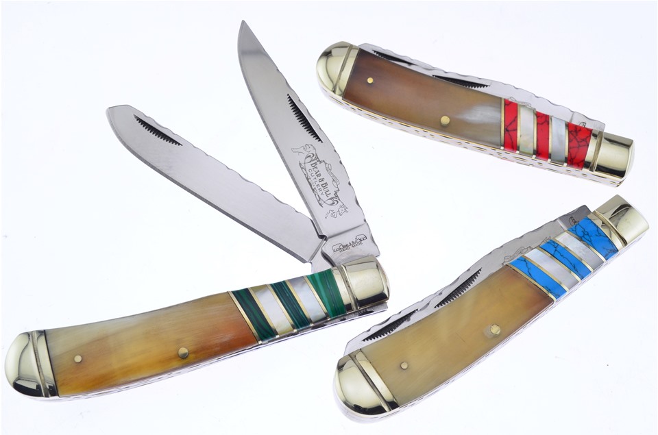Here's a value you really don't want to miss. You'll get one of the 4 1/4" Ox Horn/Blue/MOP Combination Trappers, one of the 4 1/4" Ox Horn/Green/MOP Combination Trappers, featuring Stainless Steel Blade, and one of the 4 1/4" Ox Horn/Red/MOP Combination Trappers with Nickel Silver Bolsters. Not all of these components will stay in stock, so throw this in your shopping cart now!