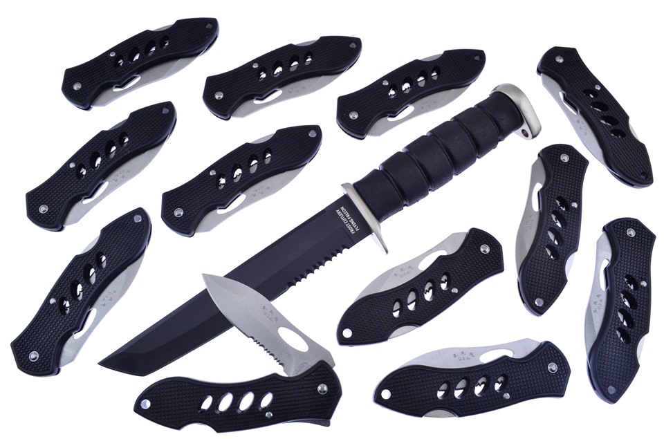 This set by Frost Cutlery is a great addition to your collection! Included in this set is one of the 12" Black Composite Tantos and twelve of the 4 1/2" Black Composite Tactical Folders. You won't find a lower price anywhere!