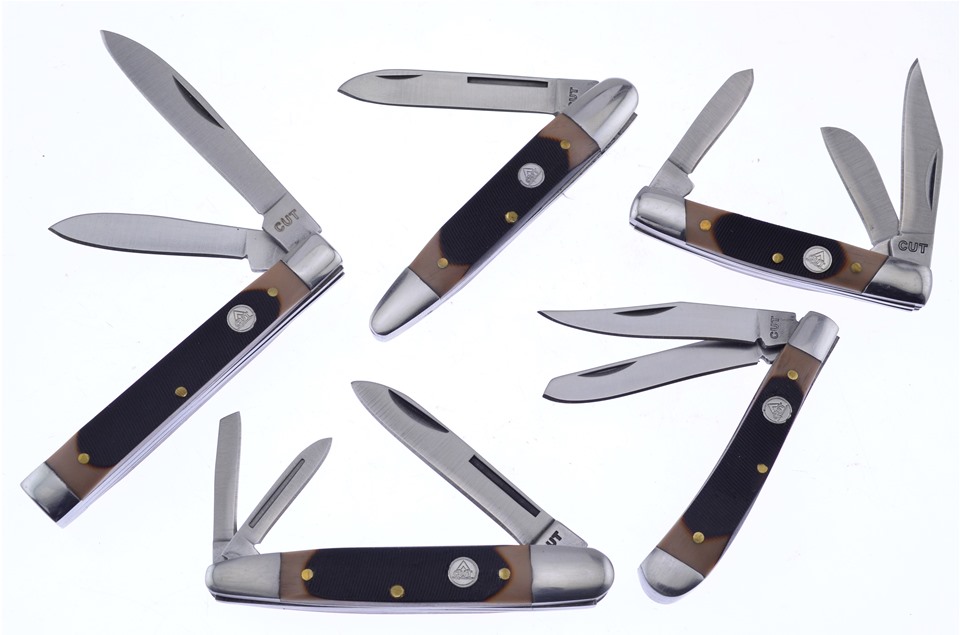 This set by Cut Brand is a great addition to your collection! You'll receive one of the 3" Brown Sawcut Delrin Trappers, one of the 2 3/4" Brown Sawcut Delrin Stockmans, one of the 3 1/8" Brown Sawcut Delrin Doctor's Knifes, featuring Thumbnail Pull, one of the 3 1/4" Brown Sawcut Delrin Whittlers, and one of the 3 1/4" Brown Sawcut Delrin Whittlers, featuring Brass Pins. Sets like these go fast, so get yours while you can!