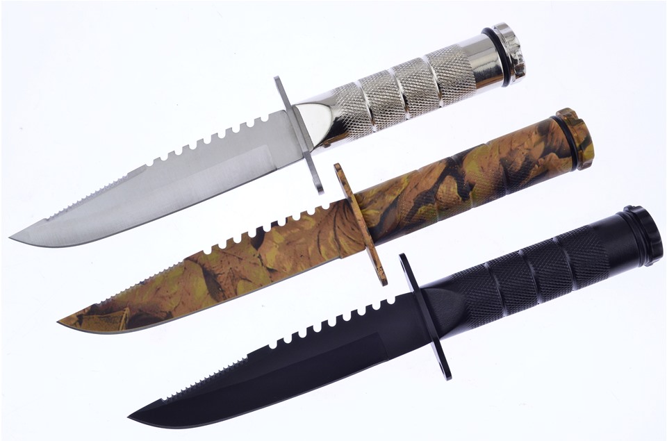 Here's a value you really don't want to miss. Included in this set is one of the 8 1/2" Black Stainless Steel Survival Knifes, one of the 8 1/2" Camo Stainless Steel Survival Knifes with Stainless Steel Blade, and one of the 8 1/2" Silver Stainless Steel Survival Knifes. You won't find a lower price anywhere!
