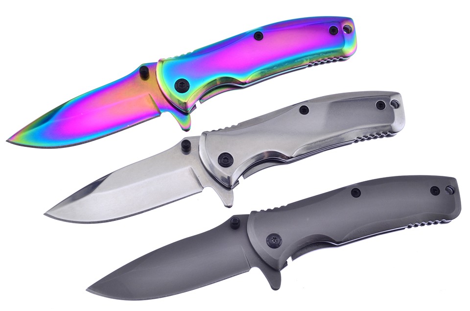Here's a set of knives no collector will want to miss. You'll get one of the 3 1/2" Gray Stainless Steel Snapshot Tacticals, one of the 3 1/2" Rainbow Titanium Snapshot Tacticals, featuring Adjustable Blade Tension, and one of the 3 1/2" Silver Stainless Steel Snapshot Tacticals with Adjustable Blade Tension. Sets like these go fast, so get yours while you can!