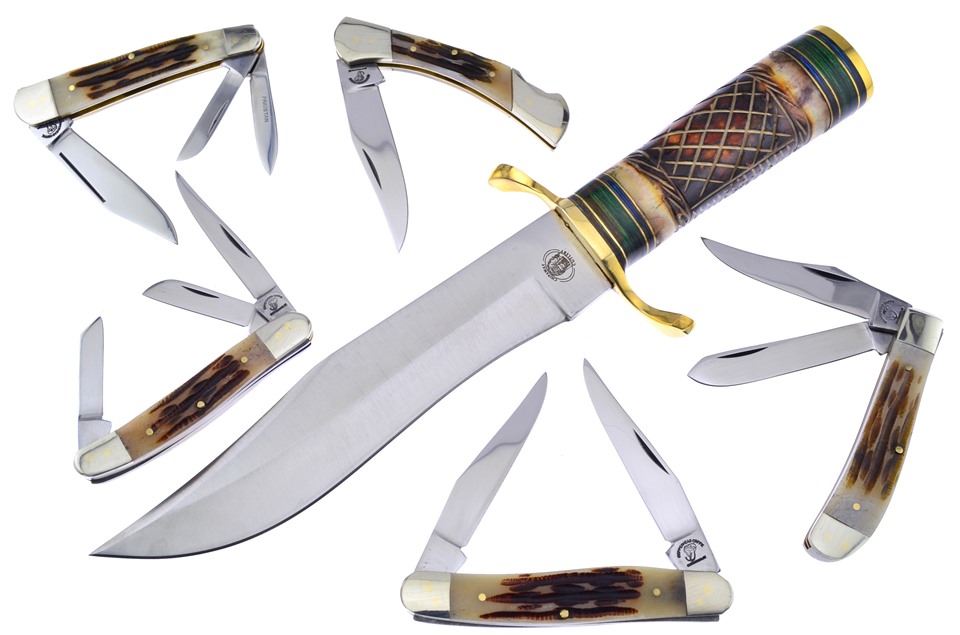 Here's a set of knives no collector will want to miss. You'll receive one of the 3 1/2" Autumn Second Cut Bone Bullet Trappers, one of the 3 1/2" Autumn Second Cut Bone Whittlers, one of the 3 7/8" Autumn Second Cut Bone Muskrats, featuring Stainless Steel Blade, one of the 3" Autumn Second Cut Bone Warrior Lockbacks with thumbn, one of the 3 1/4" Autumn Second Cut Bone Range Riders with Nickel Silver Bolsters, and one of the 12" Brown Bone Bowies, featuring Brass Pommel. Not all of these components will stay in stock, so throw this in your shopping cart now!