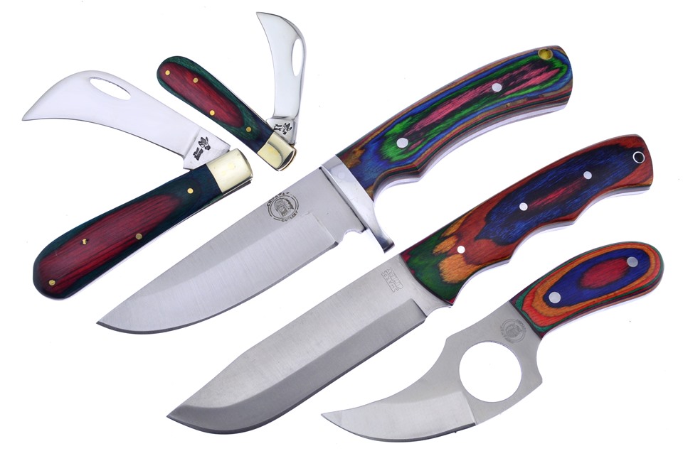Here's a set of knives no collector will want to miss. You'll receive one of the Frostwood Hawkbills, one of the 2 3/4" Frostwood Little Hawkbills, featuring Stainless Steel Blade, one of the 8 3/4" Frostwood Hunters with Stainless Steel Pins, one of the 6" Frostwood Cat Skinners, featuring Full Tang Construction, and one of the 9" Frostwood Bowies. Sets like these go fast, so get yours while you can!