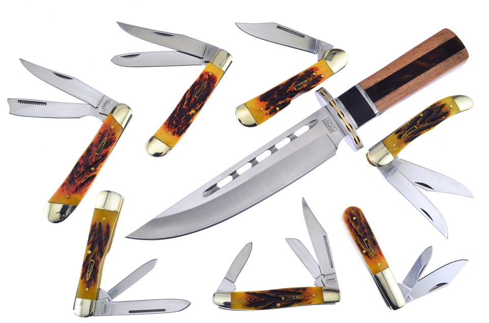 Here's a value you really don't want to miss. You'll get one of the 4 1/4" Brown Bone Trappers, one of the 4" Brown Bone Stockmans, one of the 4 1/4" Brown Bone Colorado Midlocks, one of the 3 3/8" Brown Bone Barlows, one of the 4 1/4" Brown Bone Folding Hunters, one of the 4 1/4" Brown Bone One Arm Razors, featuring Nickel Silver Bolsters, and so much more! You won't find a lower price anywhere!