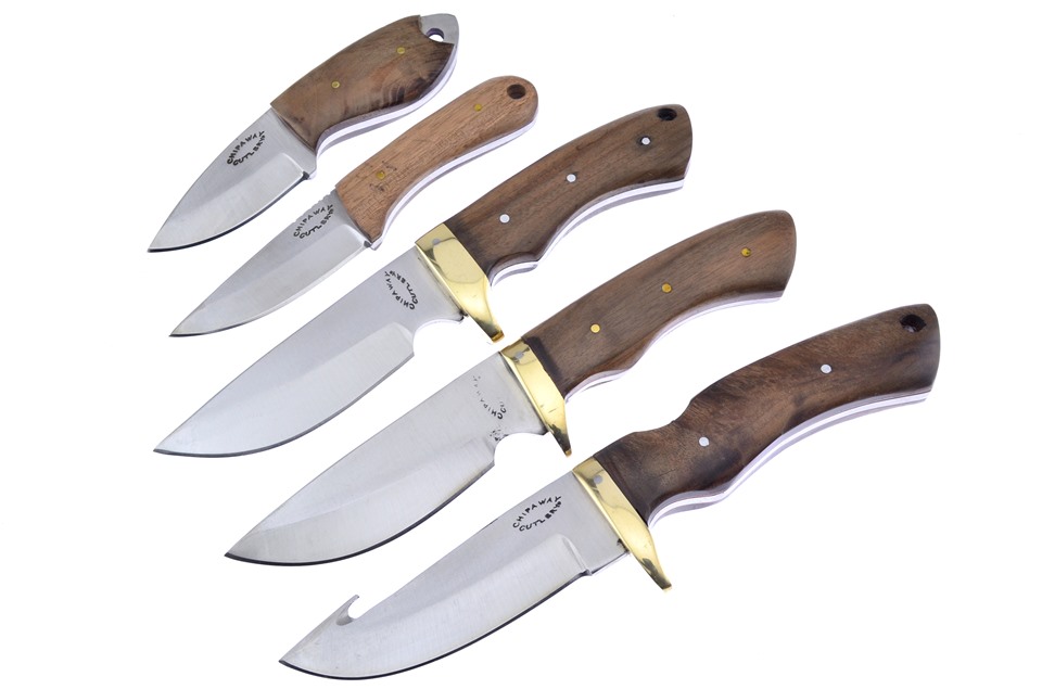 Here is a set of Chipaway Cutlery knives you don't want to miss! Included in this set is one of the 5 3/4" Walnut Wood Skinners, one of the 9" Walnut Wood Guthook Hunters with Brass Guard, one of the 8" Walnut Wood Skinners, one of the 5 3/4" Walnut Wood Thumb Knifes, featuring Lanyard Hole, and one of the 8" Walnut Wood Skinners with Brass Pins. You won't find a lower price anywhere!