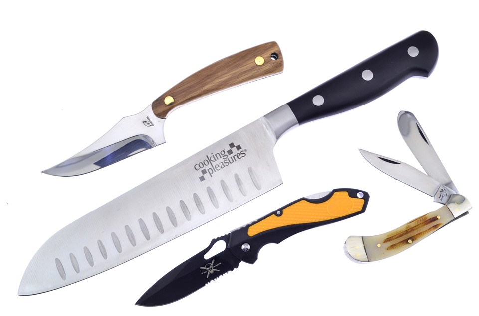Here's a set of knives no collector will want to miss. Included in this set is one of the 3 1/4" Second Cut Bone Little Saddlehorns, one of the 12" Black Composite Santoku Knifes, featuring Stainless Steel Blade, one of the 7" Zebra Wood Skinners with Full Tang Construction, and one of the 3 3/4" Orange Composite Tactical Folders, featuring Lockback. You won't find a lower price anywhere!