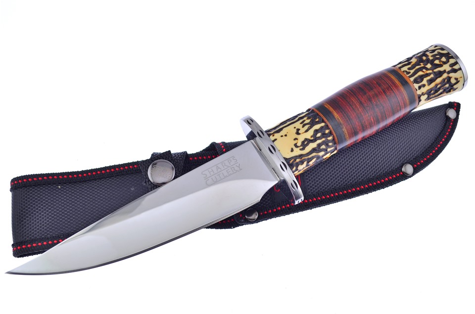 This Sharps Cutlery 11" Stagolon/Leather Combination Bowie is a customer favorite! With Stainless Steel Pommel, Nylon Sheath, and Tooled Guard, this item is going to sell like hotcakes, so get yours now.