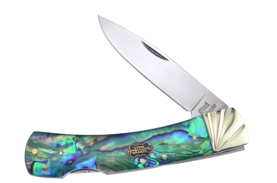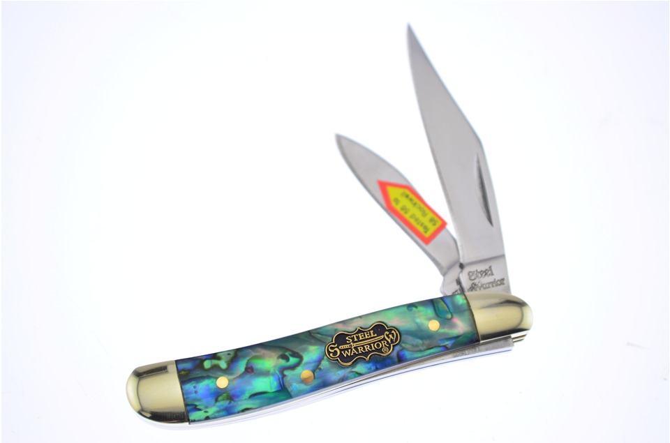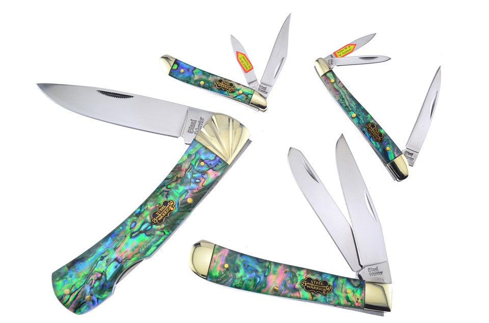 Here is a set of Steel Warrior knives you don't want to miss! You'll get one of the 2 7/8" Abalone Little Peanuts, one of the 4 1/4" Abalone Trappers, featuring Brass Pins, one of the 3 1/2" Abalone Warn Cliff Whittlers with Brass Pins, and one of the 5 3/4" Abalone Lockbacks. Not all of these components will stay in stock, so throw this in your shopping cart now!