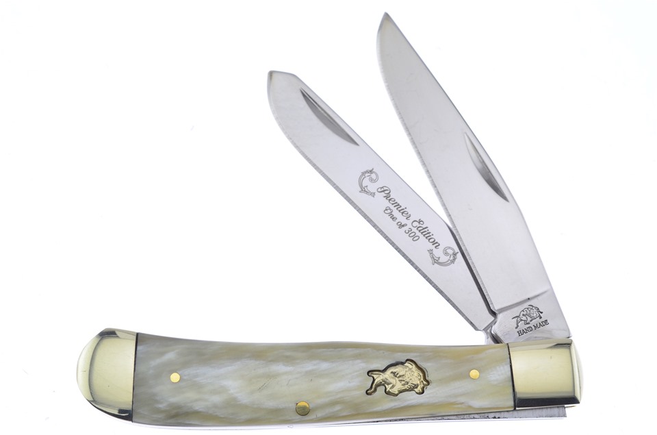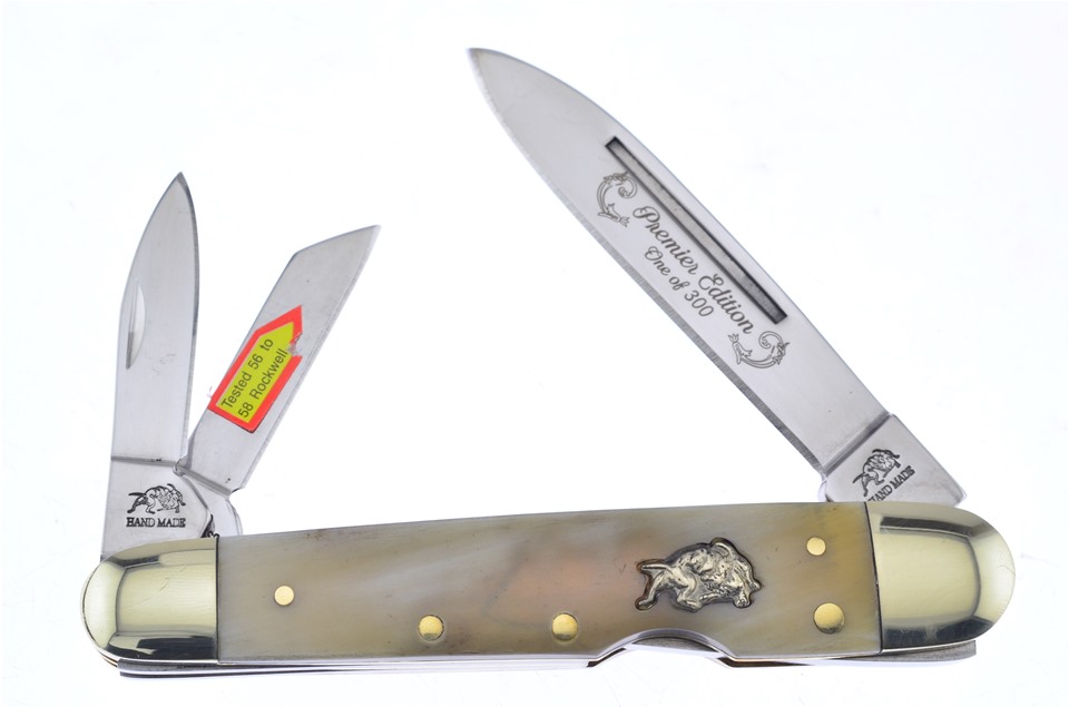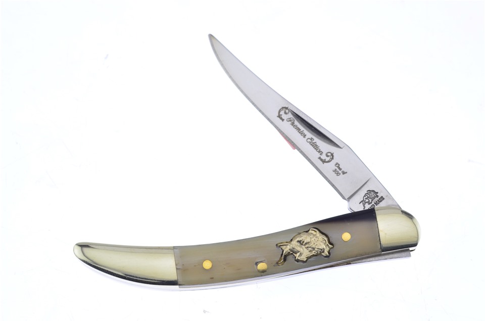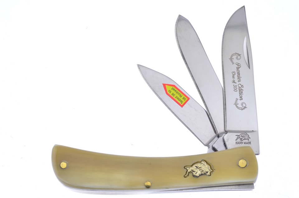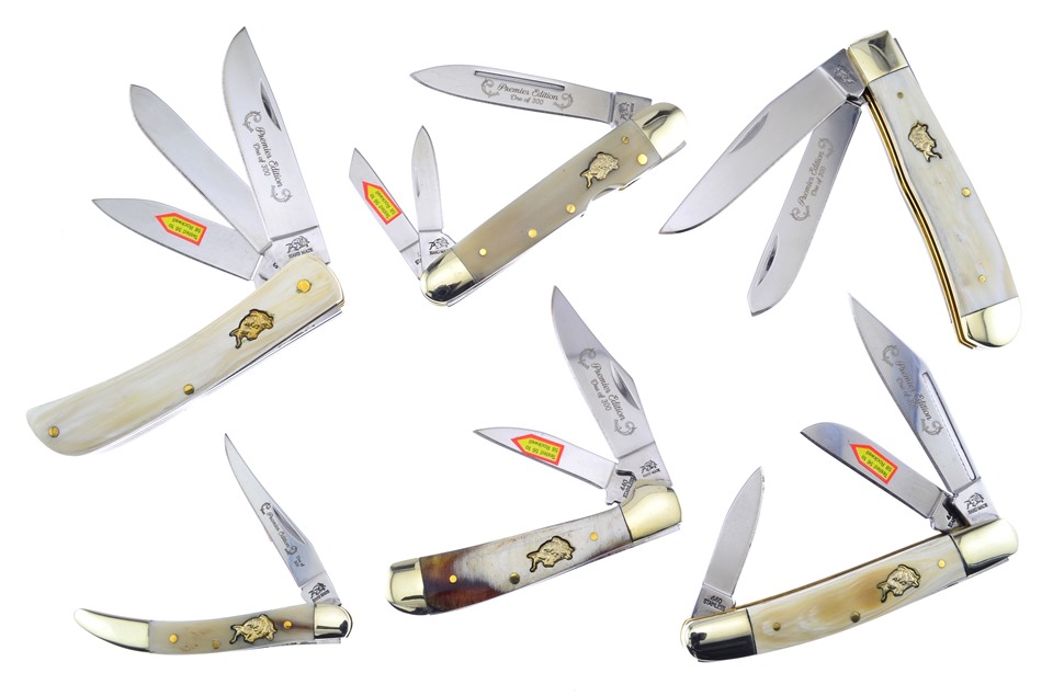 Here's a value you really don't want to miss. Included in this set is one of the 3 1/4" Ox Horn Locking Copperheads, one of the 4 1/4" Ox Horn Trappers, featuring Premier Edition, one of the 3" Ox Horn Small Toothpicks with 440 Stainless Steel Blade, one of the 4" Ox Horn Wranglers, one of the 4" Ox Horn Lockback Whittlers, and one of the 4" Ox Horn 3-Blade Dirt Busters with Brass Liners. You won't find a lower price anywhere!