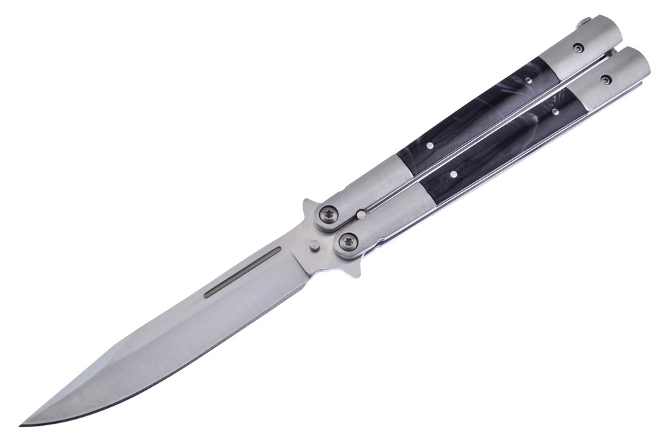 This Frost Cutlery 5 1/4" Black Marble Composite Butterfly Knife is a customer favorite! With details like Safety Latch , Stainless Steel Bolsters, and Stainless Steel Blade, you need to pop this in your cart now while supplies last!