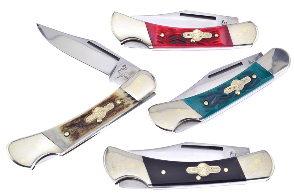 Here's a value you really don't want to miss. You'll receive one of the 3 1/2" Buffalo Horn Lockbacks, one of the 3 1/2" Stag Lockbacks, featuring Stainless Steel Blade, one of the 3 1/2" Green Picked Bone Lockbacks, featuring Thumbnail Pull, and one of the 3 1/2" Red Picked Bone Lockbacks, featuring Nickel Silver Bolsters. You won't find a lower price anywhere!