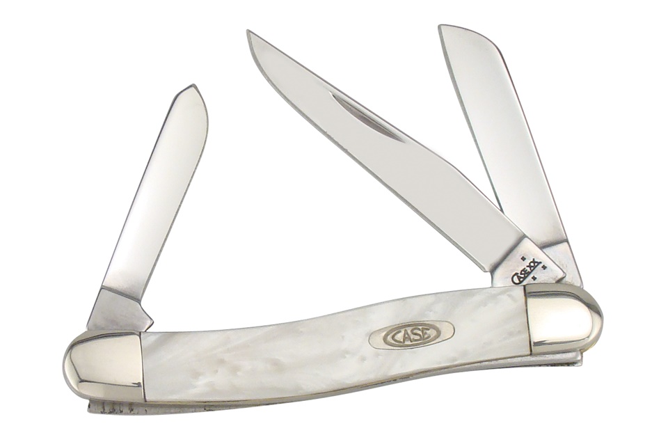 The 3 5/8" White Pearl CorelonĀ® Stockman by Case is a long-time best-seller! With Brass Liners, Nickel Silver Bolsters, and Custom Shield, this is going to be flying off the shelves, so don't miss your chance to get one!