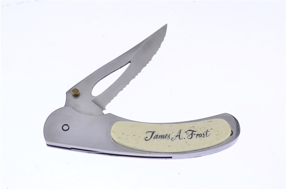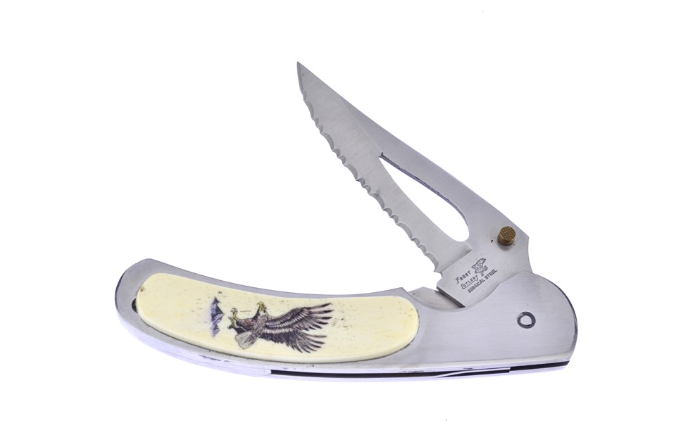 This 4 1/2" White Smooth Bone Folder by Frost Cutlery is a great choice for any collector. This knife from Jim Frost's personal collection features a Spectrum Freehand design on one side and James A Frost on the reverse side. With Etched Handle, Freehand Drawing, and Serrated Blade, no one can resist, so get yours while you can!