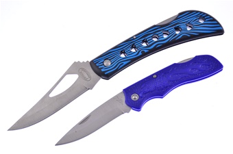 Item# CCN-080195 Show Sample Blue Micarta Easy Pull Damascus