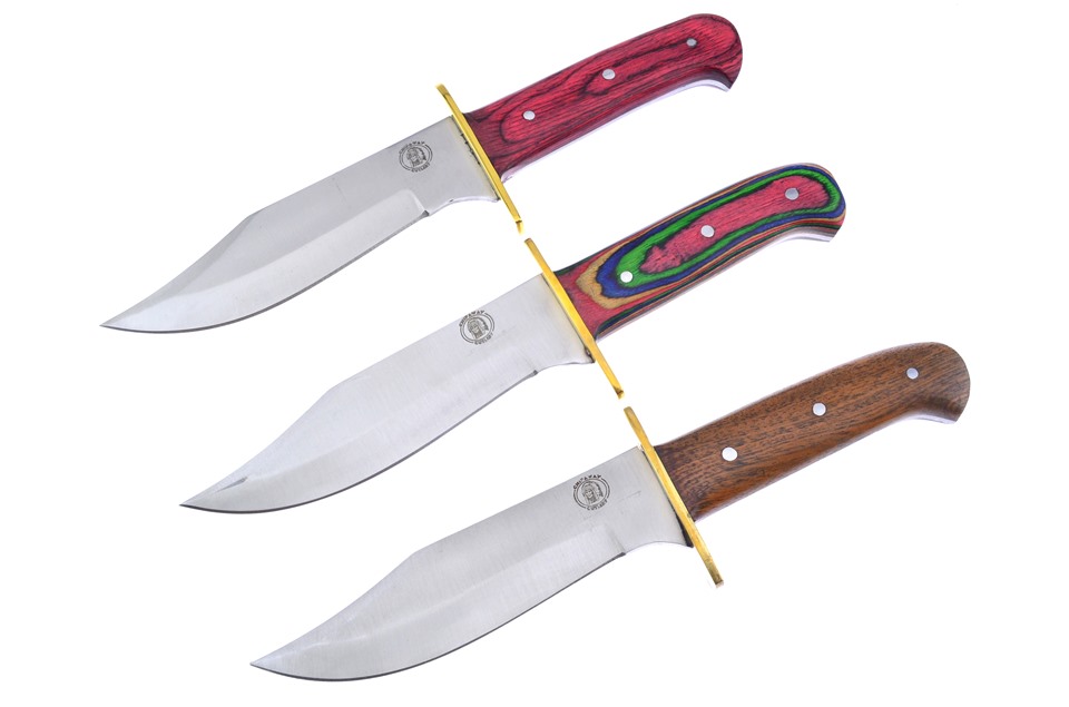 Here's a value you really don't want to miss. You'll receive one of the 10 1/2" Frostwood Bowies, one of the 10 1/2" Red Wood Bowies, featuring Full Tang Construction, and one of the 10 1/2" Walnut Wood Bowies. Sets like these go fast, so get yours while you can!
